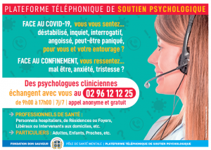 La Fondation Bon Sauveur met à disposition des professionnels et des particuliers une plateforme téléphonique de soutien psychologique animée par des psychologues de la Fondation Bon Sauveur. Le numéro de cette plateforme est le 02.96.12.12.25, elle fonctionne 7j/7 de 9h à 17h.